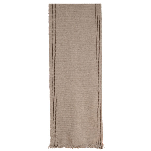 Alfombra pasillera gris y café, tejida a telar pot Margarita Marilao, de la agrupación Kuifi Kimün (‘saber ancestral’, en mapudungún).